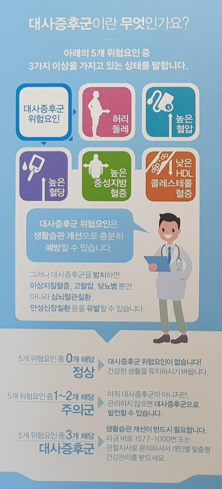 대사증후군 진단과 대사증후군 검사에 대해 말씀드리겠습니다. 다음 대사증후군 진단과 대사증후군 검사에서 아래 기준 중 3가지 이상이 해당되는 경우 대사증후군이라고 진단합니다.1.중심비만:남성의 경우 허리둘레가 102cm 초과,여성의 경우 허리둘레가 88cm초가(한국인 및 동양의 경우 대개 남성의 경우 허리둘레 90여성 80 이상) 2.고중성지방혈증:중성지방:150mg/dL 이상 3.고밀도지질 콜레스테롤이 낮은 경우:남성 40mg/dL 미만,여성은 50mg/dL 미만 3.공복혈당이 100mm/DL 미만 3.혈압이 수축 고혈압