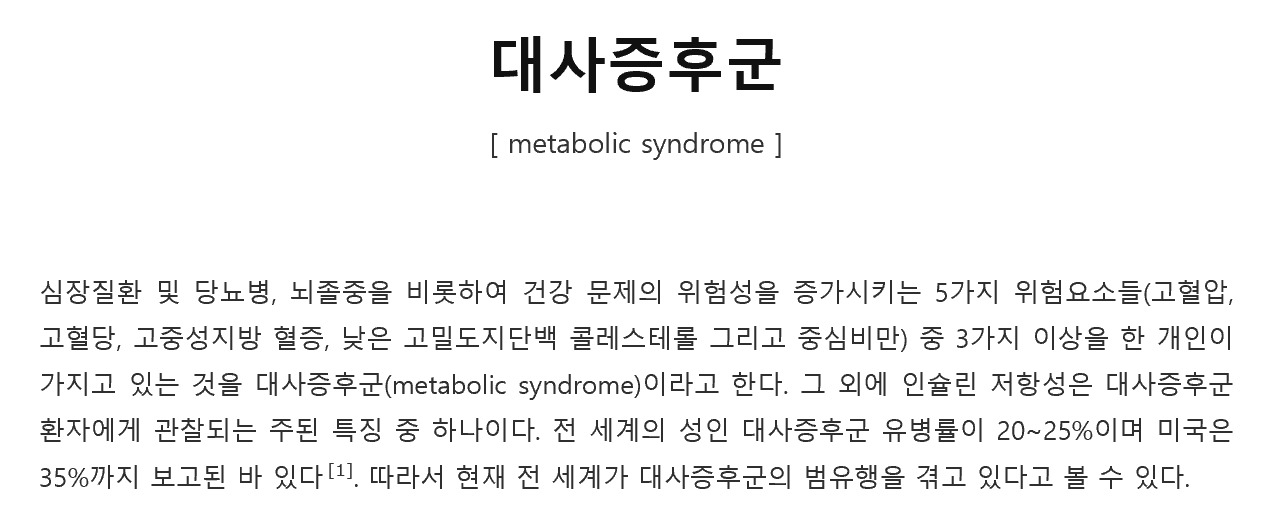 대사증후군의 원인은 아직 정확하게 밝혀지지 않았지만 인슐린 저항성, 운동 부족, 잘못된 생활습관 그리고 유전적 요인 등으로 추정하고 있습니다.대사증후군 증상은 대부분 무증상이지만 대사증후군의 각 구성요소에 따라 대사증후군 증상이 다양하게 나타날 수 있습니다. 즉, 고혈당이 심하면 당뇨병 증상이 나타날 수 있고 대사증후군에 따른 죽상경화증 증상이 나타날 수도 있습니다.